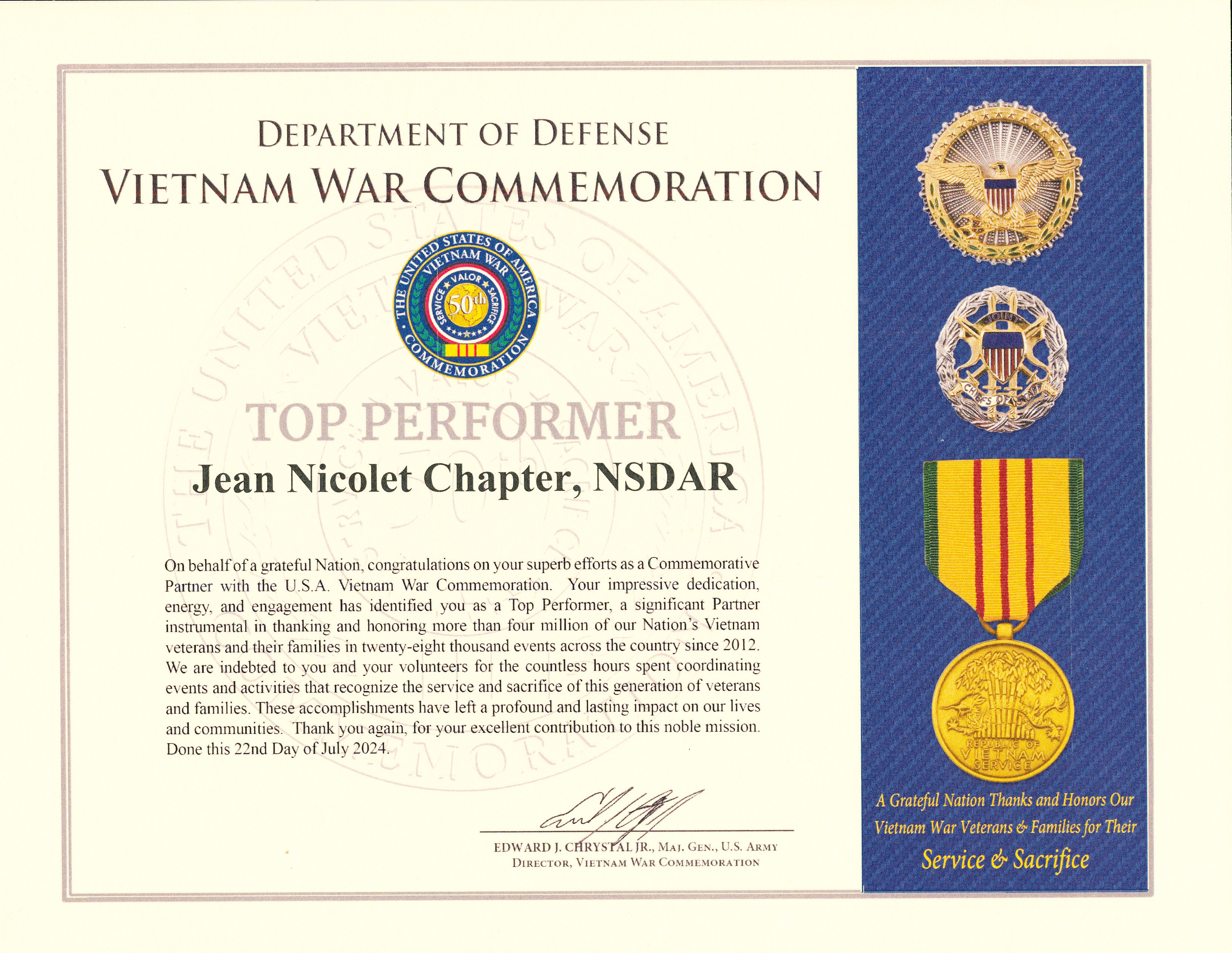 Honoring those who serve, or have served, is a cornerstone of the DAR. The Jean Nicolet Chapter, NSDAR, proudly participates in activities that celebrate and support our nation’s heroes.
